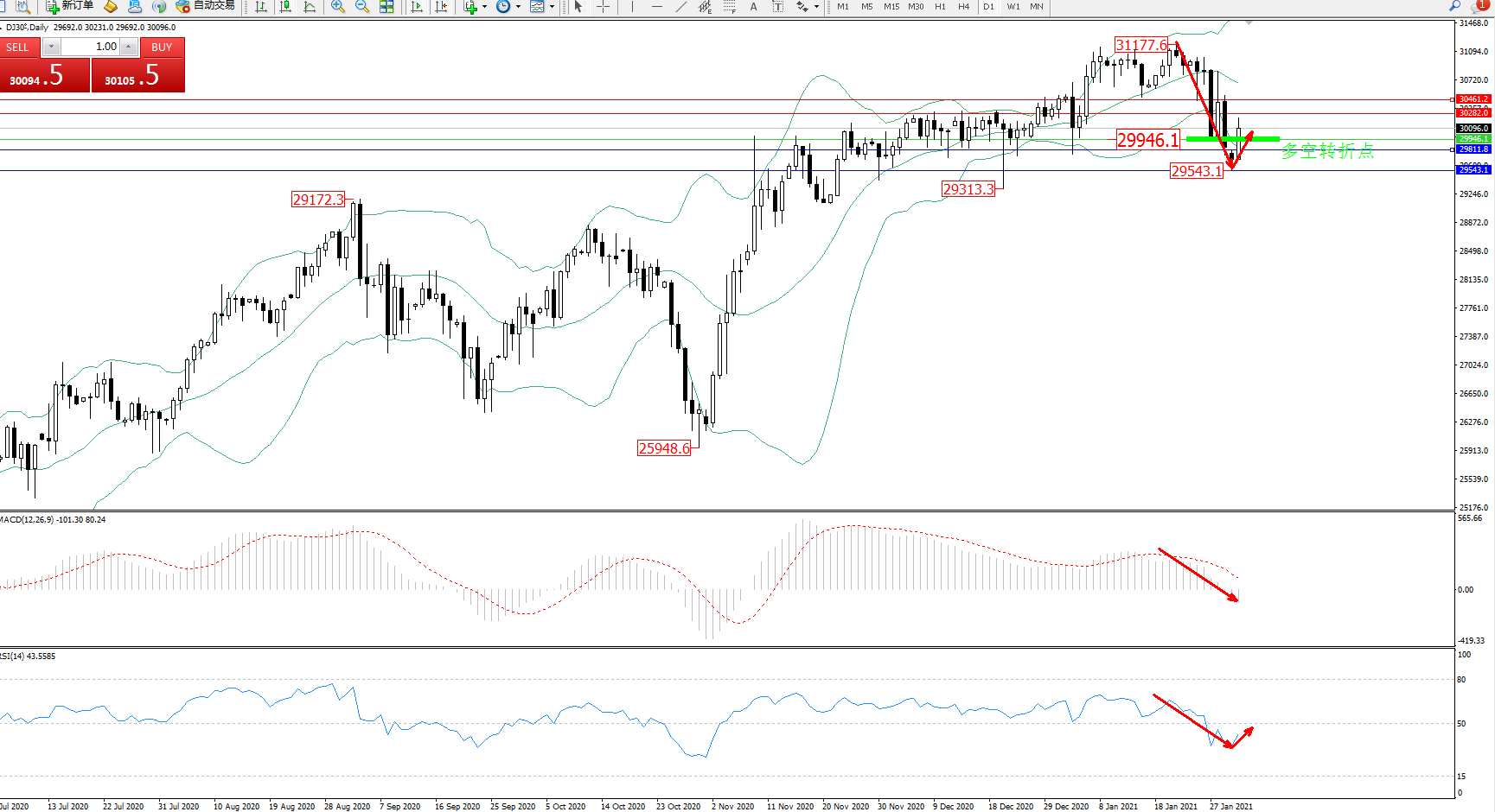 技术点评:高位空头动力维持震荡下行至29543位置节点后得到短暂支撑快速回升,布林带指标呈张口走势后有收口迹象,关注下轨附近上方节点,MACD指标处于多头区域维持弱势整理平缓下行至0轴线下方徘徊,RSI指标处于50均衡线下方维持窄幅整理平移中;