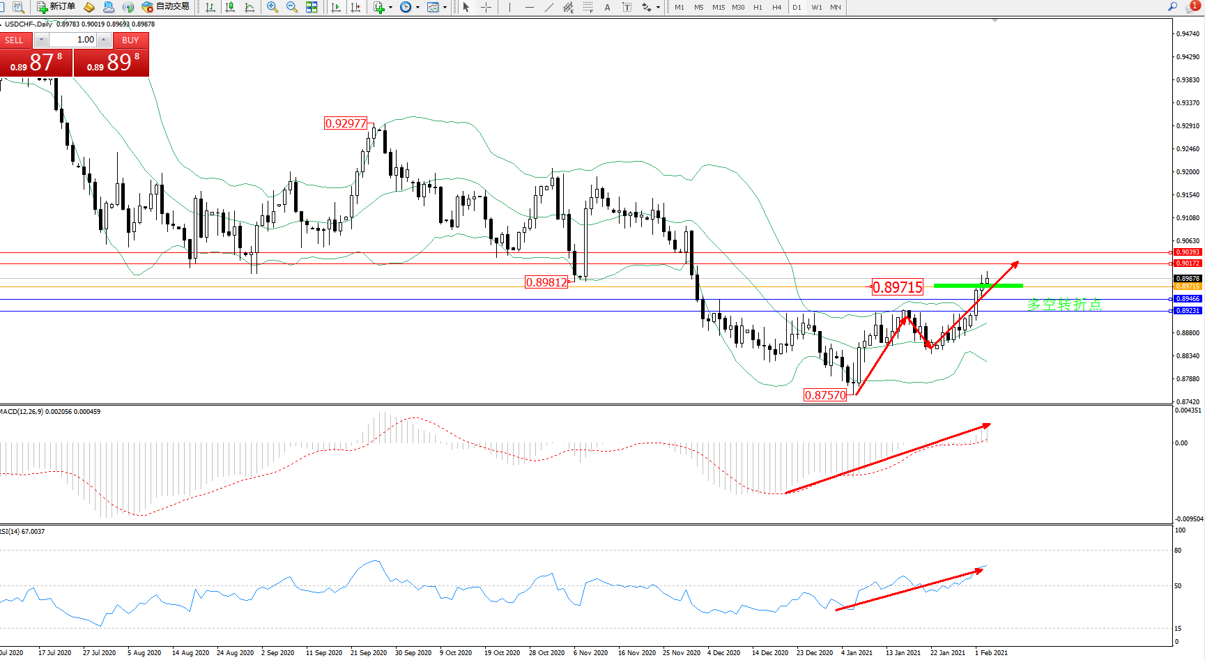 美元兑瑞郎升至两个月新高0.89893附近徘徊,距0.90心理关口仅一步之遥。周三日内汇价仍然维持强势盘整,蓄势伺机进一步上破;在美国新政府就职以来,市场风险偏好情绪发生的微妙变化正推动避险资金向美国本土市场回流,这令避险货币日元和瑞郎的汇价走势在近日都一同承压;短线美元兑瑞郎在0.90关口仍面临一定的阻力,需更强力基本面消息刺激方可突破,因而本周稍后美国就业数据的影响力将进一步凸显,如果美国开年以后的数据显示疫情新一轮的冲击开始消退,经济将重回正轨,那么美元汇价也将进一步走高,并与欧系货币走势构成明显反差,反之,则市场乐观情绪的消退会令非美避险货币,包括瑞郎在内重返强势趋势之中。