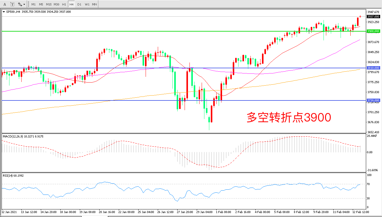 上周五(2月12日),美国消费者信心意外恶化,投资者静候美国大规模财政刺激出炉的进展,美股指盘中窄幅波动,涨跌间交替,标普500尾盘大幅拉升,收报3934.00点。目前美国众议院的多个委员会已批准民主党人提议的1.9万亿美元抗疫救助计划,推动众议院在本月底以前批准整个方案。众议院议长佩洛西周四称,她认为众议院将在本月底之前通过救助方案,送交拜登批准。