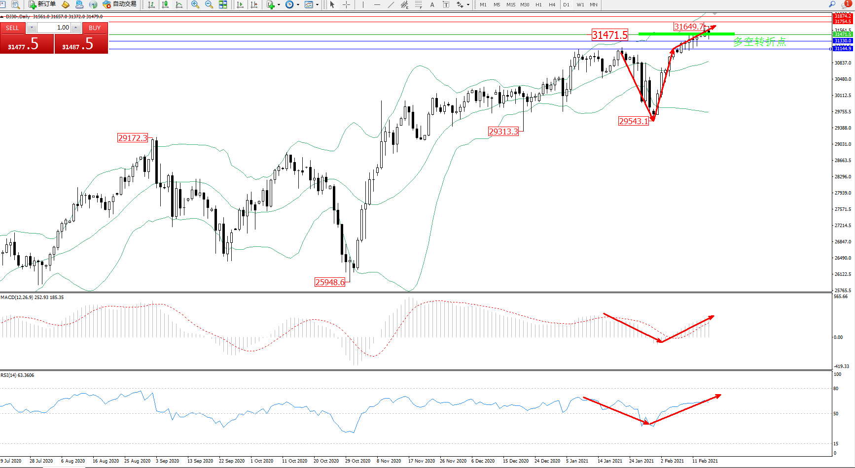 技术点评:高位呈V型反转态势强势拉升上扬,高位抵达31649附近节点徘徊中,处于布林带指标中上轨区间持续震荡,布林带指标呈缓慢张口走势持续中,多头动力有进一步上扬态势,MACD指标处于多头区域持续整理上移中,RSI指标处于多头区域维持持续徘徊上行中;
