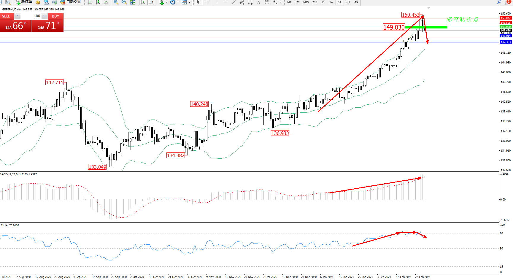 技术点评:多头动力延续布林带指标通道上轨附近节点持续震荡上扬态势良好,高位抵达150.453附近节点遇阻后开始反转急速下挫,空头动力有伺机入场继续向下移动迹象,但低位多头动力向上月底趋势依旧,布林带指标呈拉升上扬走势持续上行中,MACD指标处于多头区域维持整理平缓上扬中,RSI指标处于多头区域维持整理平缓上移至超买区80均衡线附近整理后有反转下移迹象;