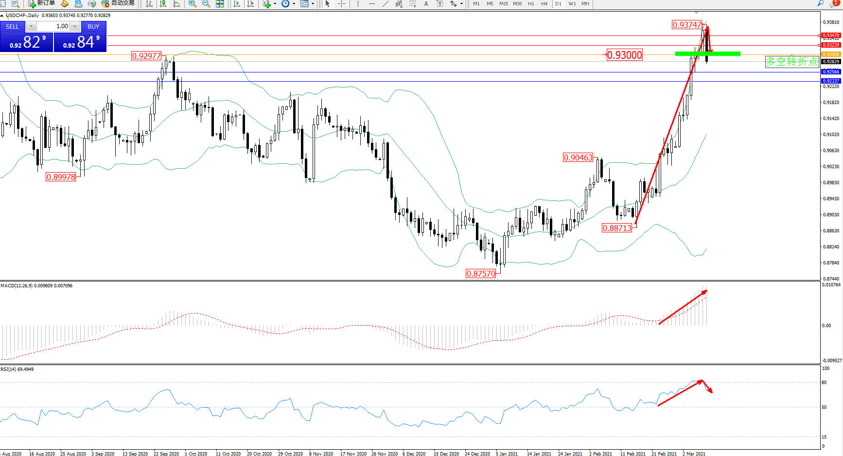 技术点评:多头动力延续布林带指标上轨附近节点持续震荡上扬,高位抵达0.93747位置后遇阻急速回撤下行,布林带指标呈张口走势后下轨附近节点有短暂收口迹象,短期回撤至前期高位0.92977位置附近震荡中,但继续移动趋势尚未有完全止步迹象,MACD指标处于多头区域维持震荡持续向上移动中,RSI指标处于多头区域维持震荡上移至超买区80均衡线附近节点整理后反转下移;