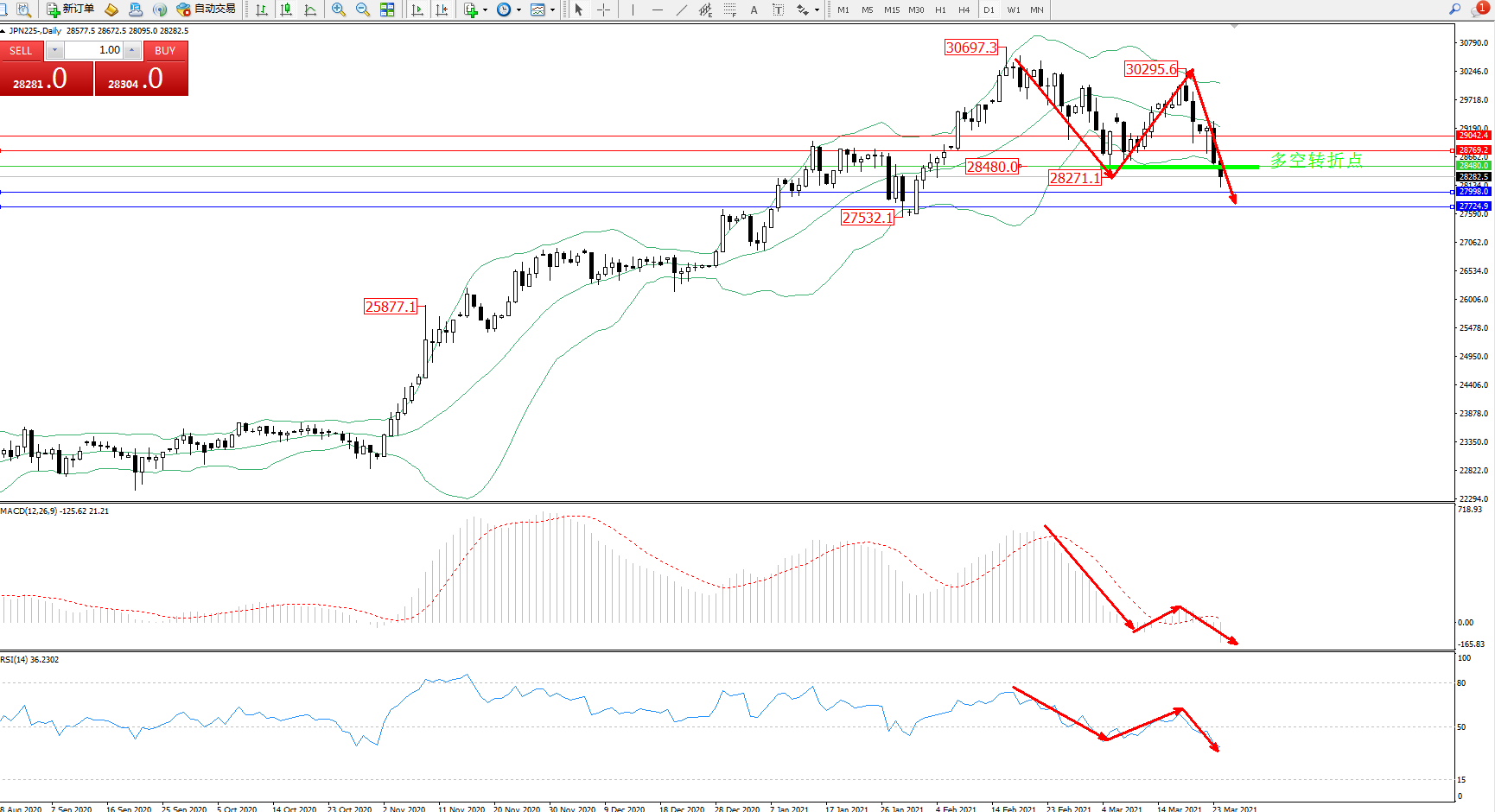 日经225指数3月24日(周三)收盘下跌579.42点,跌幅2.00%,报28416.50点。日本3月份制造业活动连续第二个月扩张,服务业的萎缩程度有所缩小;制造业活动采购经理人指数上升0.6点至52,服务业活动指数上升0.2点至46.5。数字高于50表示扩张,低于50表示收缩;日本政府上周末结束了东京地区的紧急状态。服务业遭受了两个半月的严格限制,迫使餐馆和酒吧提前关闭。现在实行的自愿限制仍将减缓复苏;乐观情绪来自于这样的预期,即随着疫苗的推出,取消紧急状态和更广泛的限制将触发国内和外部市场需求的回升。
