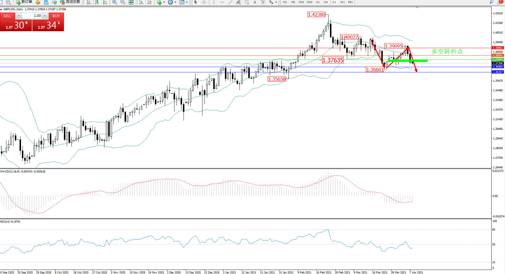 交易策略:1.37635下方看跌,目标1.36905、1.36357