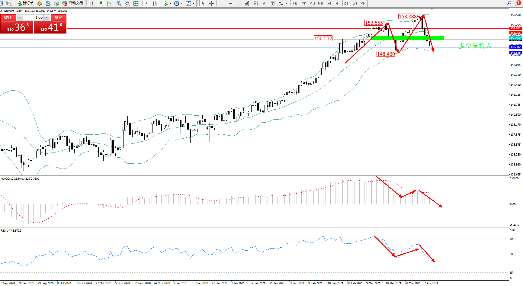 技术点评:多头动力延续布林带指标通道持续震荡上扬,高位抵达153.388位置节点遇阻回撤,急速下挫至中下轨区间震荡下行中,空头动力日渐强劲,布林带指标不断拉升上扬后,高位开始有反转平移走势,MACD指标处于多头区域持续震荡向下移动中,RSI指标高位急速下挫至0轴线下方震荡;