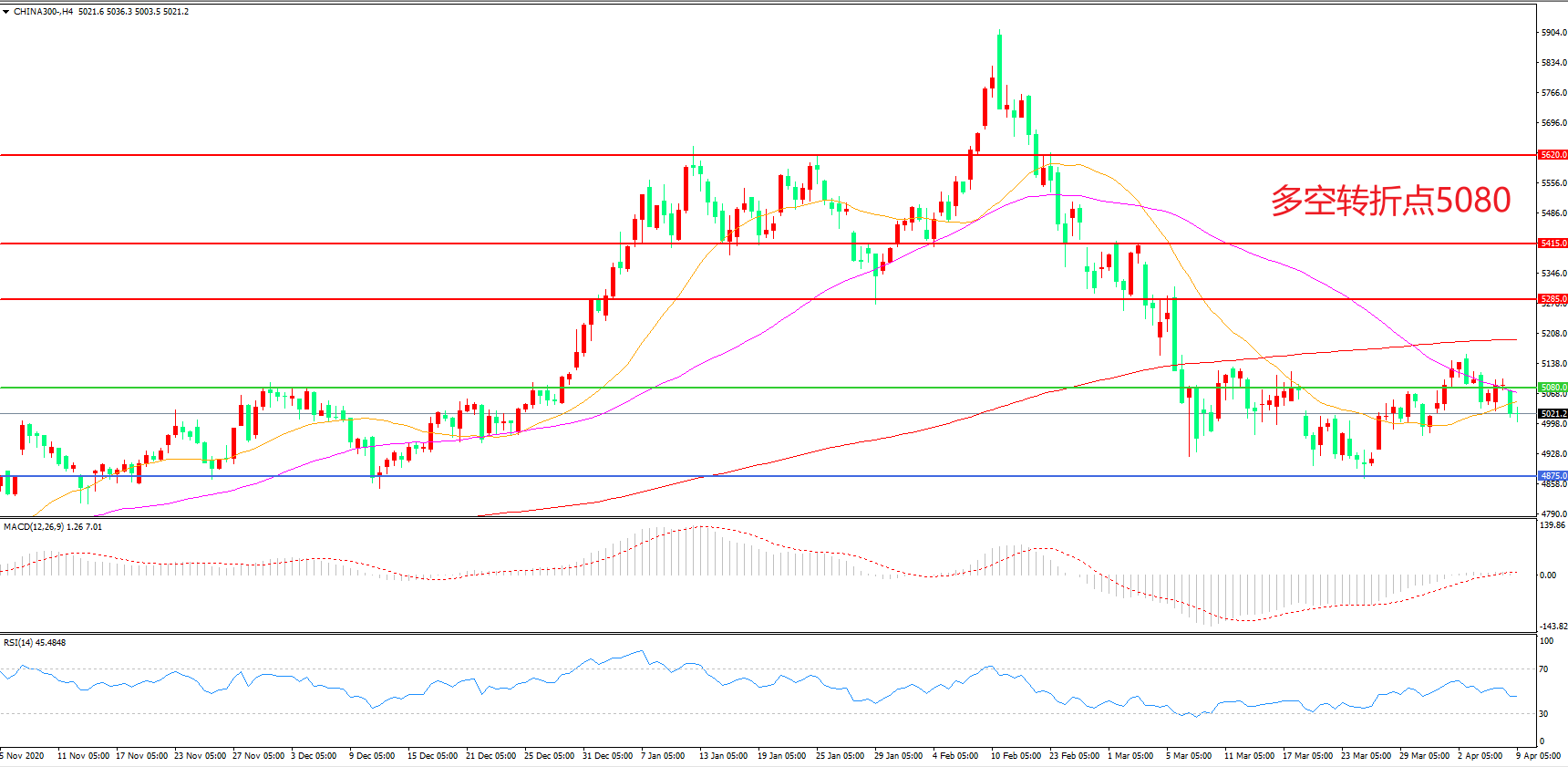 4小时图看,沪深300冲高回落,表现相对低迷,短期内延续区间震荡概率较大,55周期均线成为上方阻力,4875成为下方支撑,MACD绿柱缩短,RSI指标走平,日内延续震荡概率较大。