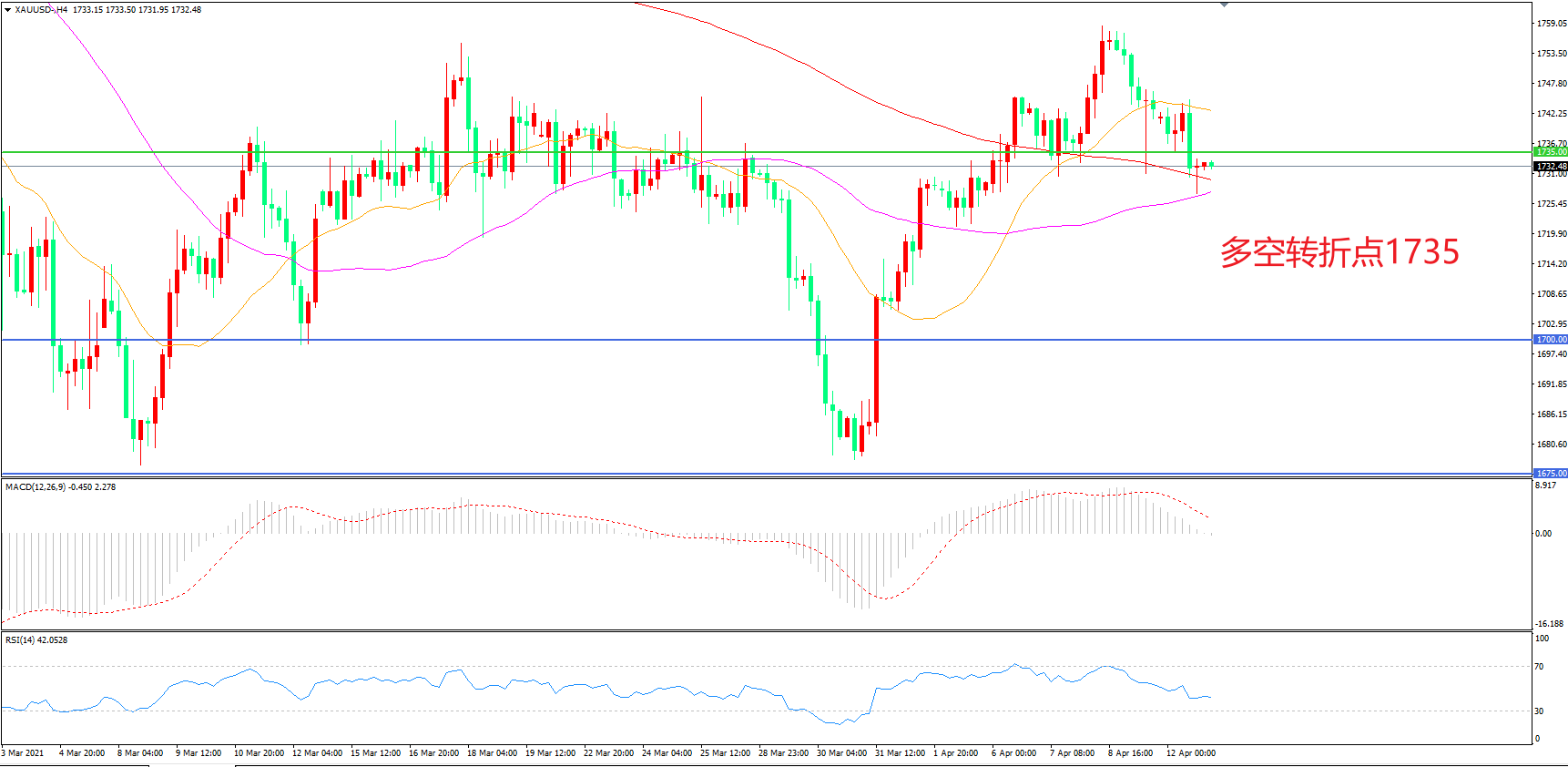 周一(4月12日),尽管美元指数重新跌向上周创下的近两周半低位91.995,但美债收益率反弹,限制了美元下行空间,也提升非孳息资产黄金的持有成本,现货黄金延续震荡调整,收报1732.65美元/盎司。近期良好的美国数据提振了美元及美债收益率的行情,金价延续高位震荡或成为近期的主旋律。