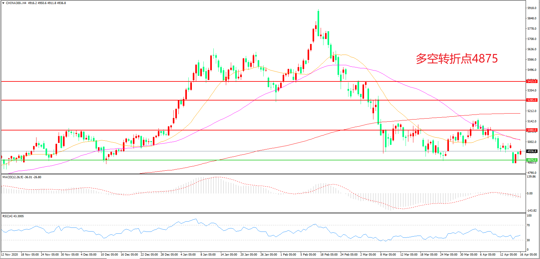 4小时图看,沪深300延续低位震荡,整体表现相对低迷,均线系统粘合成为上方阻力,4875成为多空分水岭,MACD绿柱增加,RSI指标走平,日内延续震荡概率较大。