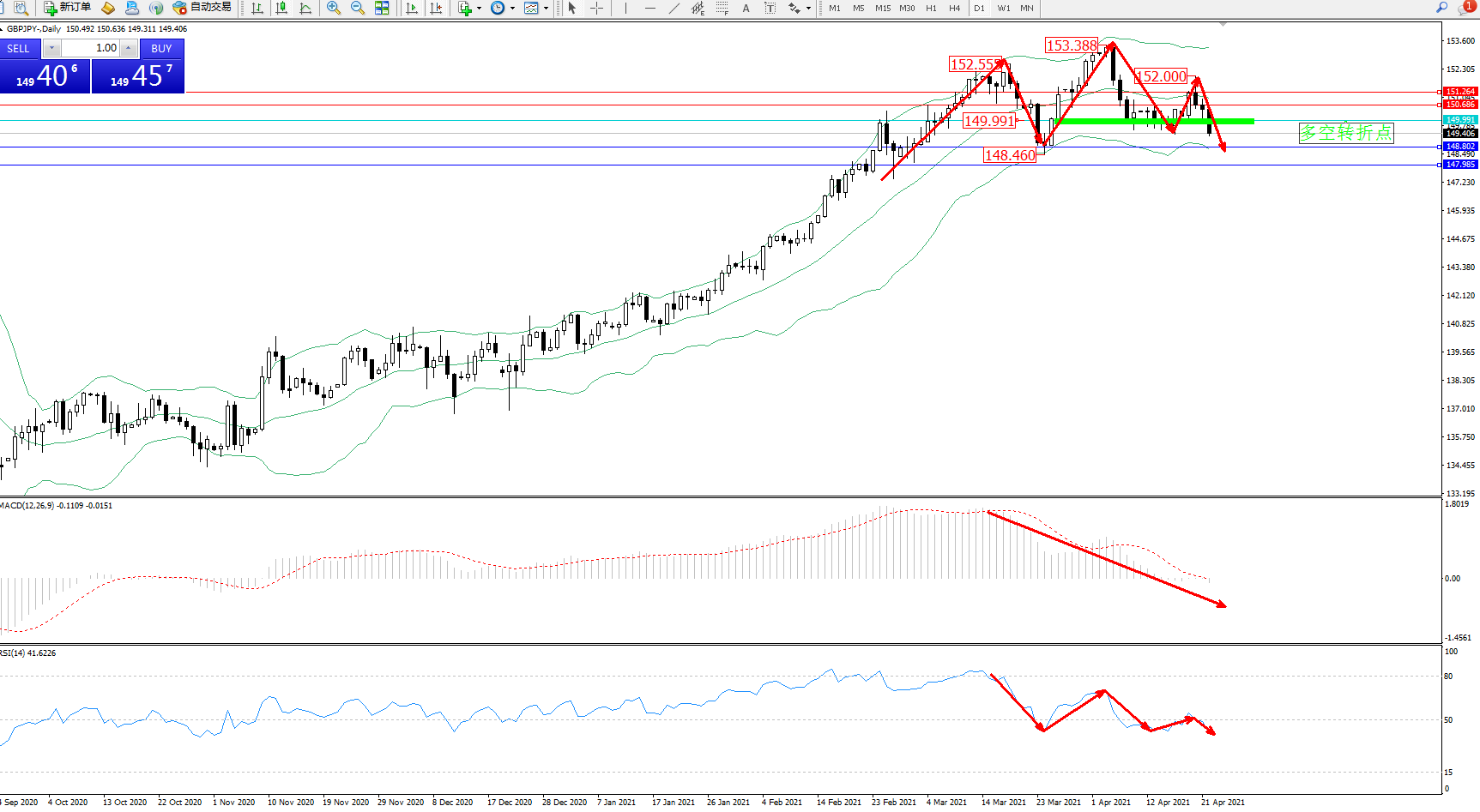 技术点评:多头动力延续布林带指标通道持续震荡上扬,高位触及153.388位置后震荡回撤下行,纠结于中下轨区间弱势整理平移,多头动力有伺上移迹象,触及中轨附近节点后再度震荡下行,布林带指标呈张口平移走势良好,关注下轨附近支撑节点,MACD指标高位空头动力震荡下行至0轴线附近节点开始徘徊,RSI指标纠结于50均衡线下方弱势整理;