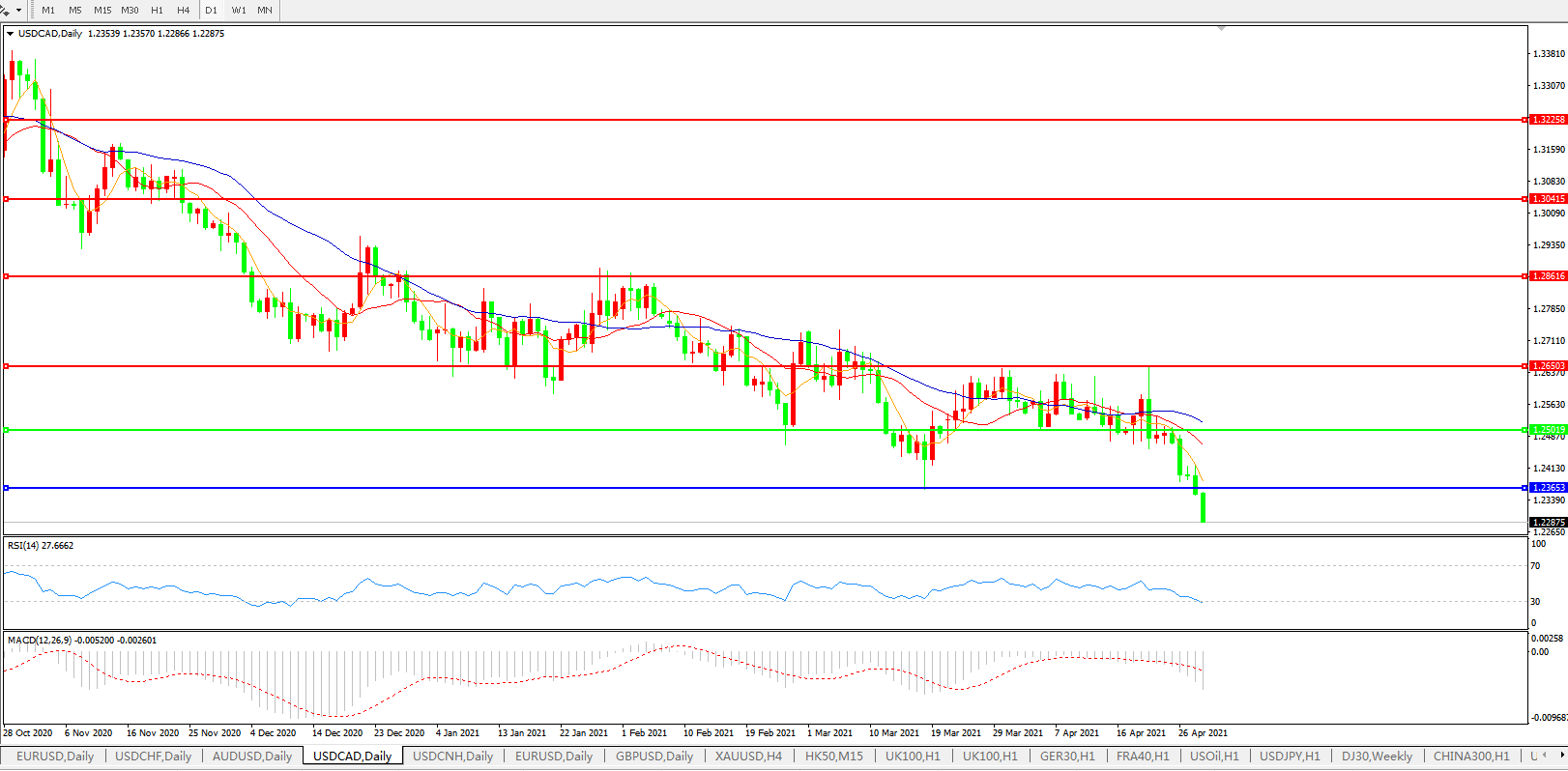 美元兑加元在周三跌至2018年2月以来近27个月低位1.2331,因原油价格进一步走升带动加元走强,且美联储决议前后美元弱势格局延续。在上周加拿大央行率先抛出缩减QE路线图之后,美联储短期无意跟进的状况,料令双边货币政策落差进一步拉大,从而令美元兑加元在此后有进一步下行的空间。