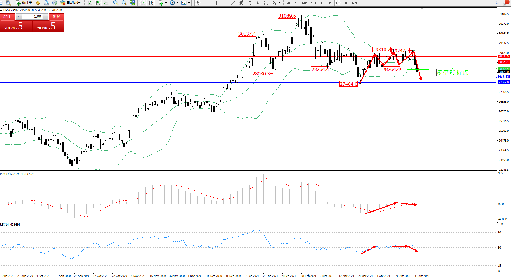 香港恒生指数5月3日(周一)收盘下跌367.34点,跌幅1.28%,报28357.54点;A股五一假期休市,港股五月开门黑,三大指数均跌逾1%,行业板块多数下挫。恒生科技指数跌1.03%报8227点。大型科技股普跌,美团、快手跌1.6%,阿里巴巴等均有跌幅,惟腾讯微幅收涨。因A股休市,南下资金港股通关闭至大市表现低迷,成交额不足千亿港元,创阶段新低。香港特区政府卫生署卫生防护中心5月3日介绍,截至当日零时,香港新增新冠肺炎确诊病例2例,均为输入型病例。香港累计报告新冠肺炎确诊病例11787例。香港经济在2021年第一季明显复苏,终止对上连续六个季度的按年收缩。经济在第一季急速反弹,主要反映在内地和美国带动的环球经济复苏下,货物出口的增长非常强劲。