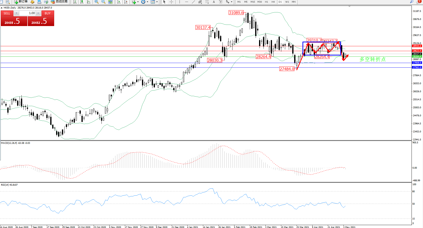 香港恒生指数5月4日(周二)收盘上涨199.6点,涨幅0.7%,报28557.14点;港股三大指数均收涨,午后涨幅明显扩大,多家投行上调香港今年经济增长预测,给予市场信心。恒生科技指数涨0.68%报8284点。大型科技股小米涨1.4%,京东、阿里巴巴均收涨;在线教育股、光伏股表现最差,烟草股、手游股全天低迷。A股五一假期继续休市,大市成交额萎缩至908亿港元。香港特区政府卫生署卫生防护中心今日下午公布,截至当日零时,香港新增4例新冠肺炎确诊病例,其中包括输入型病例3例,累计确诊病例达11790例。香港政府统计处今日发表最新零售业销货额数字,2021年3月零售业总销货价值276亿元,同比升20.1%,预期为34%;其中网上销售占7.7%。2021年首季零售业总销货价值同比上升7.5%,远较2019年第一季的销货量低32.5%。政府发言人表示,虽然社交距离措施自2月中逐渐放宽后,本地消费情绪有所改善,但由于访港旅游业持续低迷,零售业的短期前景仍然困难。