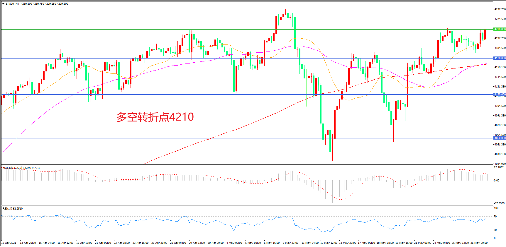 4小时图看,标普500呈现区间震荡形态,4210成为短期多空分水岭,21周期均线成为短期支撑,MACD红柱缩短,RSI指标走平,日内震荡上行概率较大。