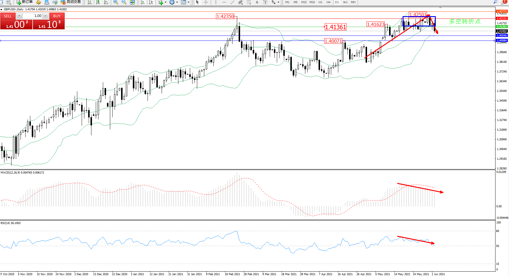 交易策略:1.41361下方看跌,目标1.40546、1.40084