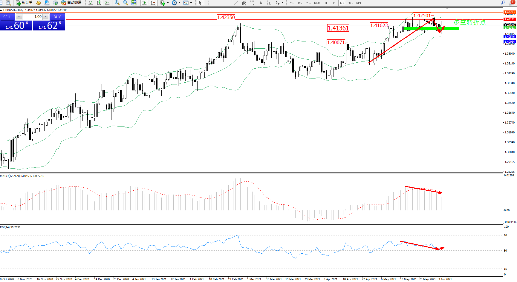 交易策略:1.41361上方看涨,目标1.42121、1.42773