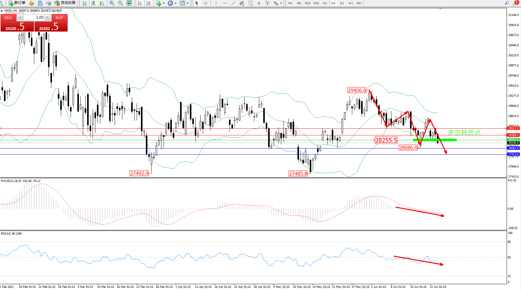 恒指HK50 ——4小时K线图显示: