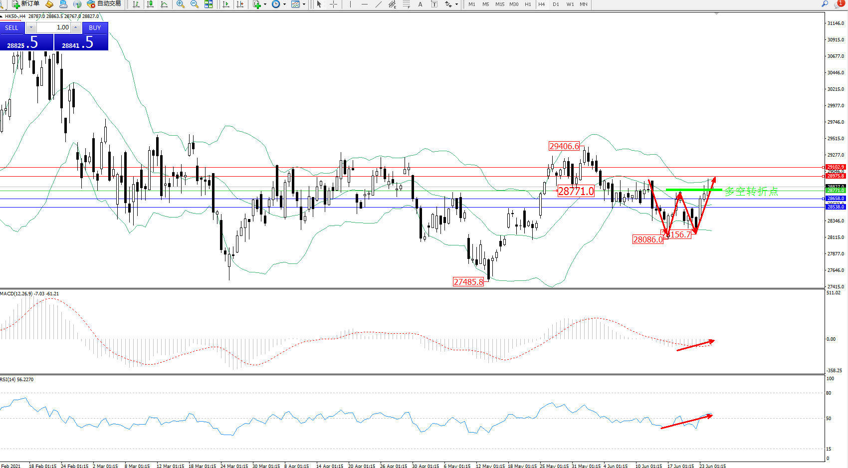 恒指HK50 ——4小时K线图显示: