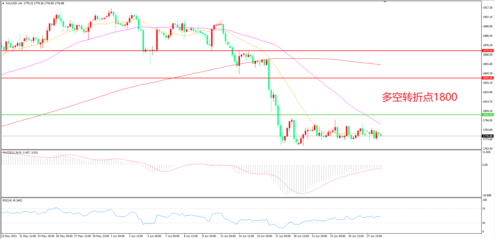 交易策略:在1800.00之下看跌,目标1760.00 1730.00