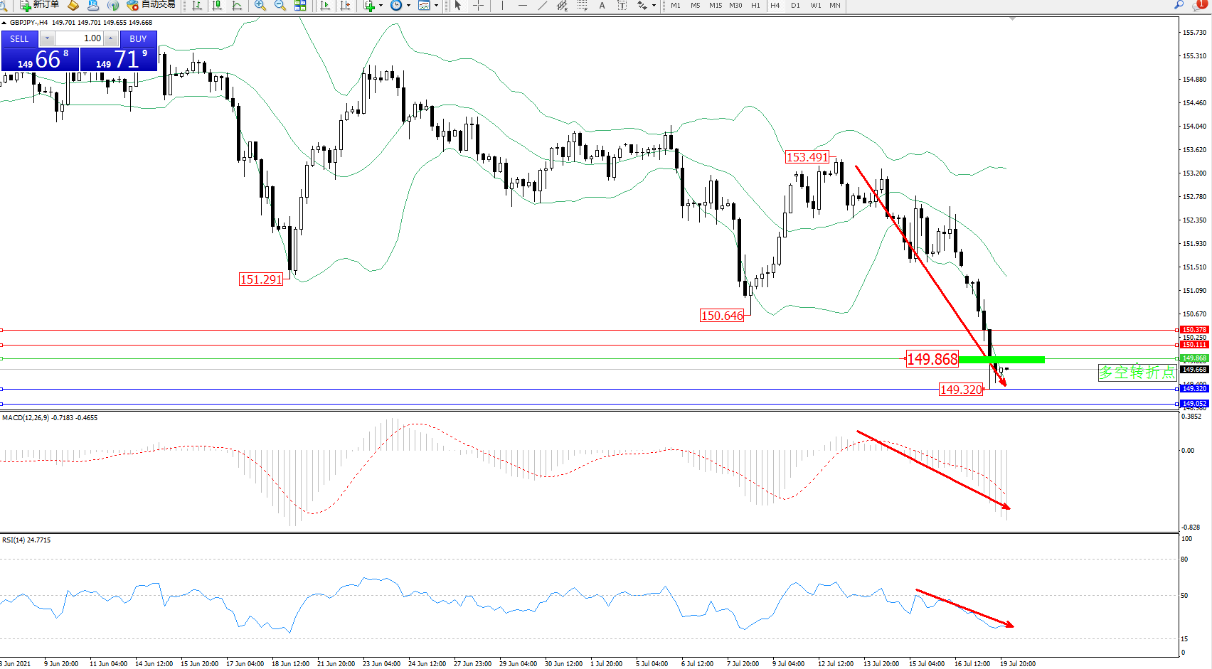 技术点评:空头动力延续布林带指标下轨附近持续震荡下行,低位抵达149.320附近后开始整理,空头下行趋势态势良好,布林带指标呈张口走势持续中,MACD指标处于空头区域不断下行中,RSI指标处于 50均衡线下方空头区域维持整理不断下移;