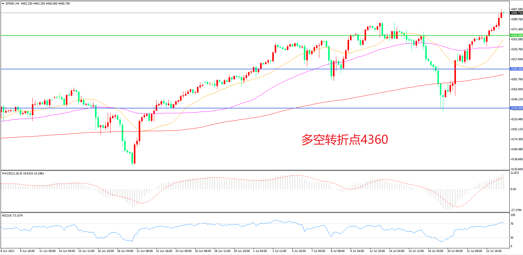4小时图看,标普500突破4360后连续拉升,整体表现偏强,短期均线拐头向上, MACD红柱增加,日内震荡上行概率较大。