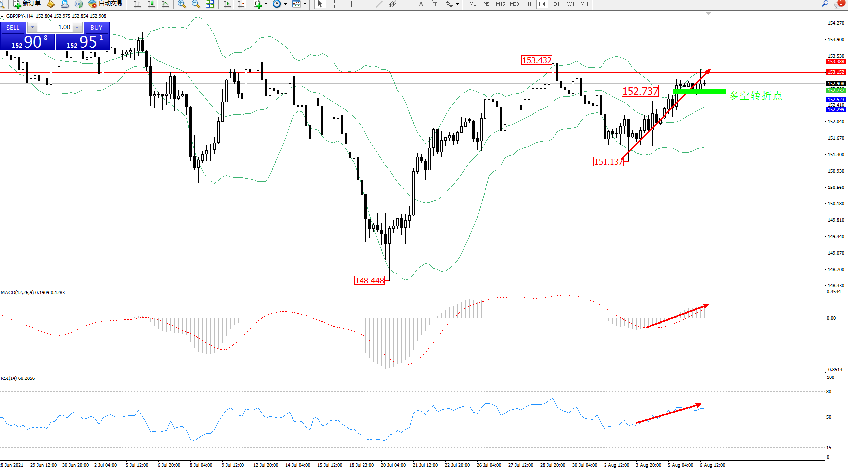 交易策略:152.737上方看涨,目标153.152、153.388