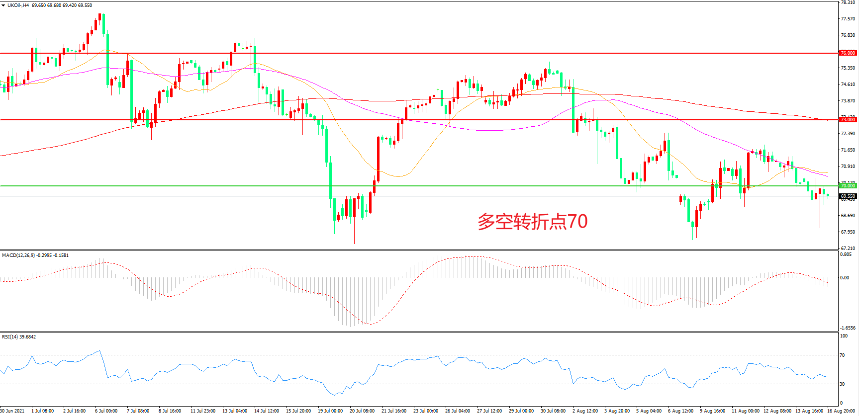 4小时图看,油价短线反弹后受制于55周期均线,70成为多空分水岭,短线行情较为低迷,MACD绿柱增加,RSI指标走平,油价震荡下行概率较大。
