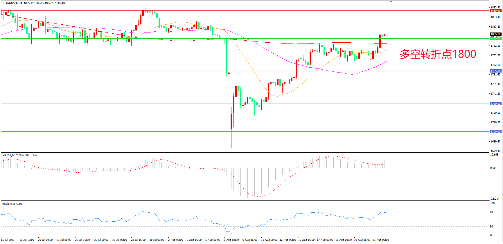 交易策略:  在1800.00之上看涨,目标1830.00       1860.00
