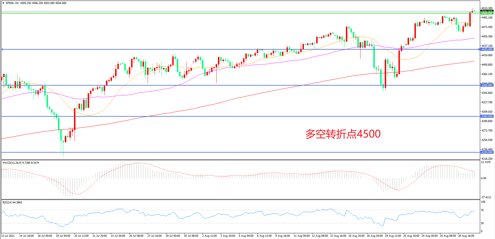 4小时图看,标普500连续拉升,上行动能较强,短期均线拐头向上,4500成为短期多空分水岭,MACD红柱增加,RSI指标走平,日内震荡上行概率较大。