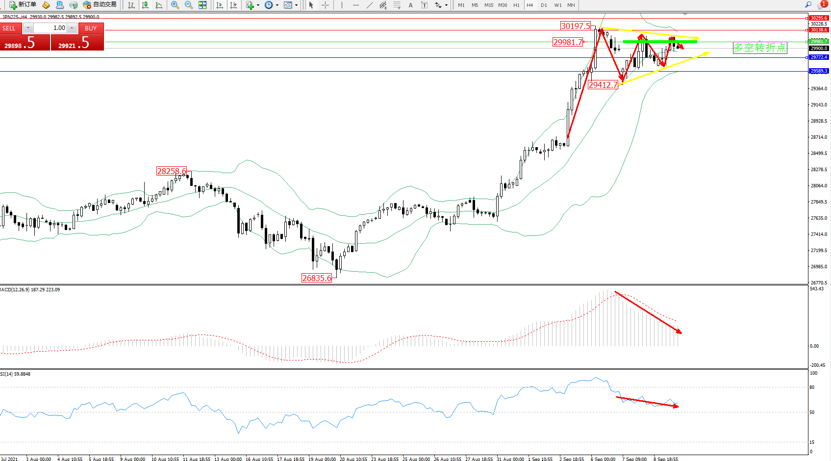 技术点评:多头动力维持在布林带指标通道内持续窄幅震荡,呈三角形态走势波幅空间逐渐收窄,布林带指标呈收口走势中,短期或将形成破位走势,MACD指标处于多头区域高位持续震荡平缓下移中,RSI指标维持在多头区域持续整理平移中;