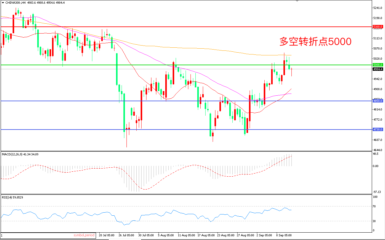 4小时图看,沪深300连续上行后受制于200周期均线,短期走势陷入震荡,21周期均线成为支撑,MACD红柱增加,RSI指标走平,日内震荡上行概率较大。