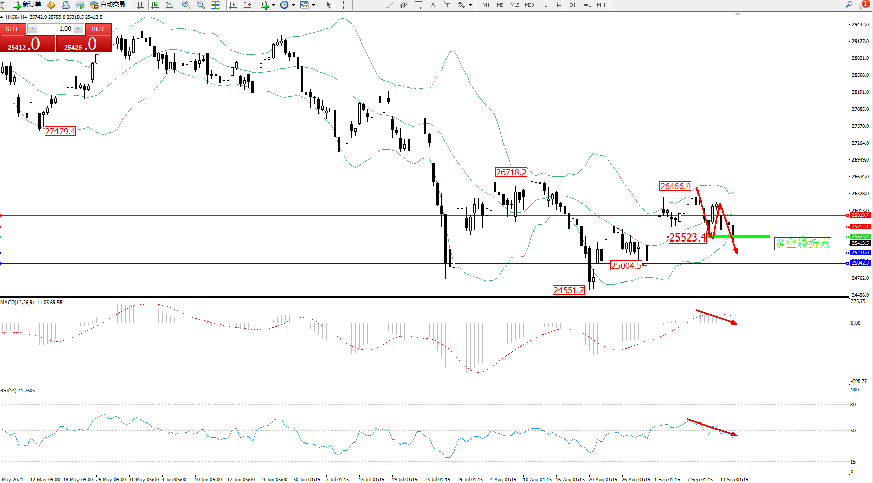 香港恒生指数9月14日(周二)收盘下跌311.58点,跌幅1.21%,报25502.23点;港股三大指数早盘震荡,午后快速下跌,市场表现情绪低迷。恒生科技指数跌1.41%报6501点。大型科技股普跌,快手跌2.5%,阿里巴巴、腾讯、百度均下跌,银行股、保险股等权重午后下挫另大市承压明显,招商银行跌超3%,中国平安跌2.7%;恒大概念股午后加速下挫,恒大汽车大幅收跌24.6%,恒大物业大跌12%创历史新低;医药类股再度爆发领涨,泰格医药、药明康德等全天表现强势,恒大集团昨日发公告称,有关恒大破产重组的言论完全失实,将全力以赴复工复产、保交楼;中国恒大今早公称,由于对集团的持续负面新闻报道严重影响潜在购房者信心,预期公司9月销售持续大幅下降,导致销售回款持续恶化,进一步对现金流及流动性造成巨大压力。