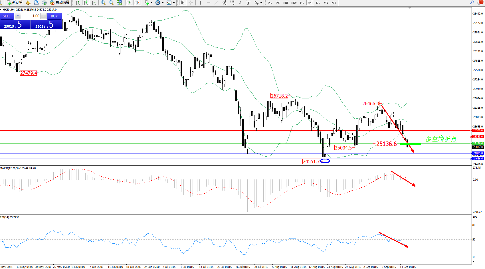 技术点评:高位空头动力持续震荡下挫,延续布林带指标下轨附近不断向下移动,空头动力跌势未见止步迹象,布林带指标呈张口走势态势良好,前期低位24551位置近在咫尺,若空头继续向下移动,近期或再度触及,MACD指标空头动力跌破0轴线进入空头区域下行,RSI指标处于50均衡线附近纠结后开始不断向下移动;