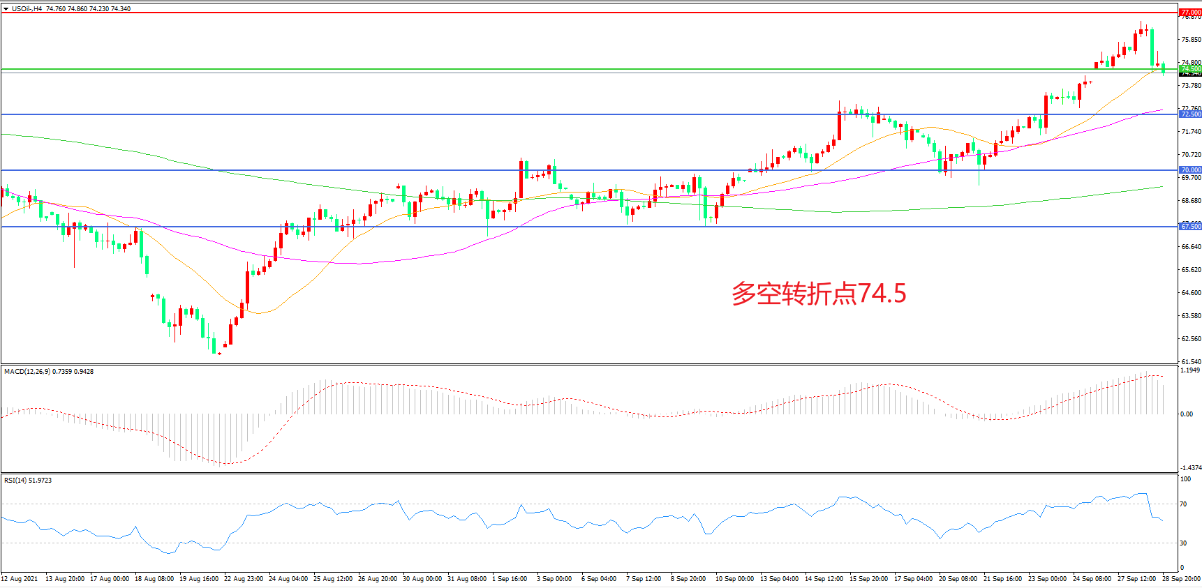 周二(9月28日), 因为有迹象表明需求超过供应并耗尽库存,全球能源偏紧的格局有加剧的趋势, 美国WTI原油大幅冲高后出现获利回吐,最终收报74.34美元/桶。在全球性电力紧张的情况下,投资者对原油价格预期明显更加乐观,在回补跳空缺口后,油价有望实现进一步拉升。