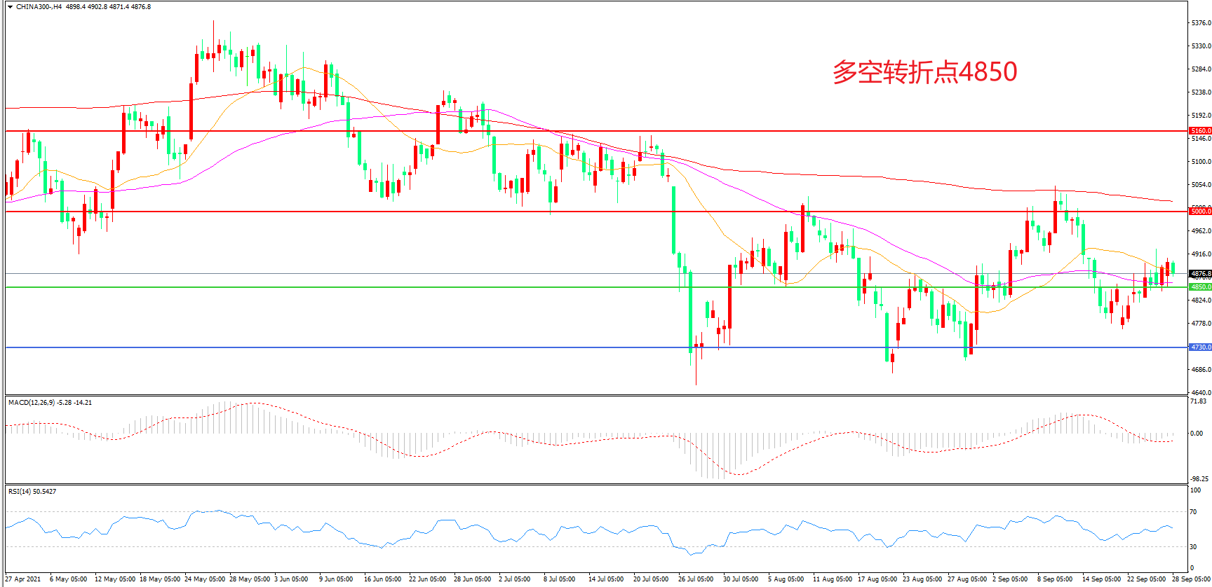 4小时图看,沪深300呈现冲高回落形态,但在4850一线逐渐站稳,200周期均线成为上方阻力,MACD绿柱缩短,RSI指标走平,日内延续上行概率较大。