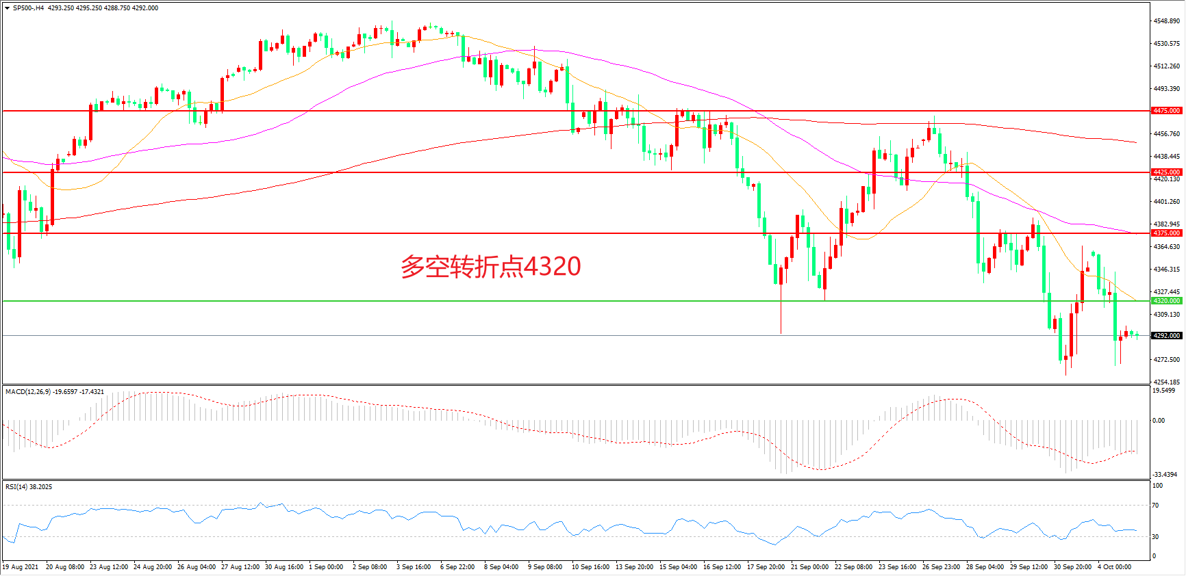 4小时图看,标普500长阴下破,短期走势陷入低迷,均线系统呈空头排列, MACD绿柱增加,RSI指标走平,日内震荡下行概率较大。