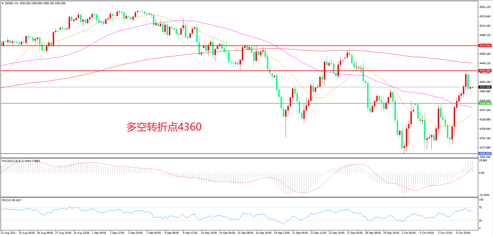 4小时图看,标普500回踩支撑后连续拉升,短期走势偏强,均线有形成金叉迹象, MACD红柱增加,RSI指标走平,日内震荡上行概率较大。