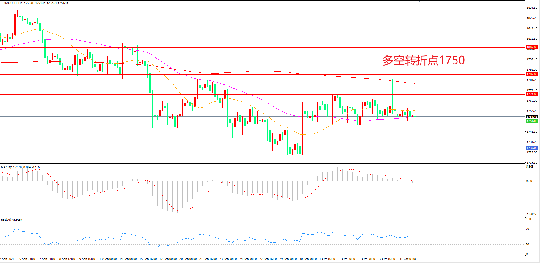 4小时图看,金价冲高回落后延续弱势震荡,1750成为多空分水岭,21周期均线成为上方阻力,MACD红柱减少,RSI指标走平,日内延续弱势概率较大。