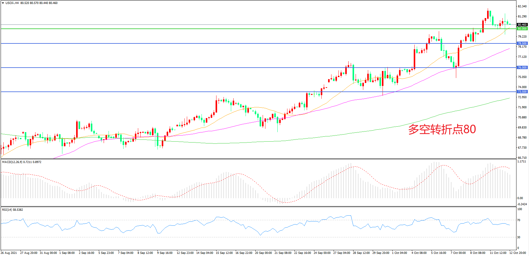 4小时图看,油价长阳拉升后延续高位震荡,多头趋势明显,均线系统呈多头排列,MACD红柱增加,RSI指标走平,日内延续上行概率较大。