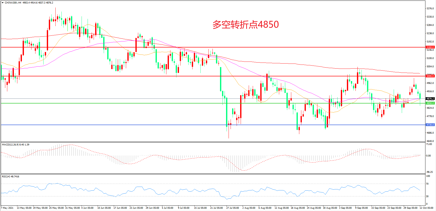 4小时图看,沪深300冲高回落,短期表现降温,但55周期均线支撑仍在,MACD红柱缩短RIS指标向下,日内延续震荡概率较大。