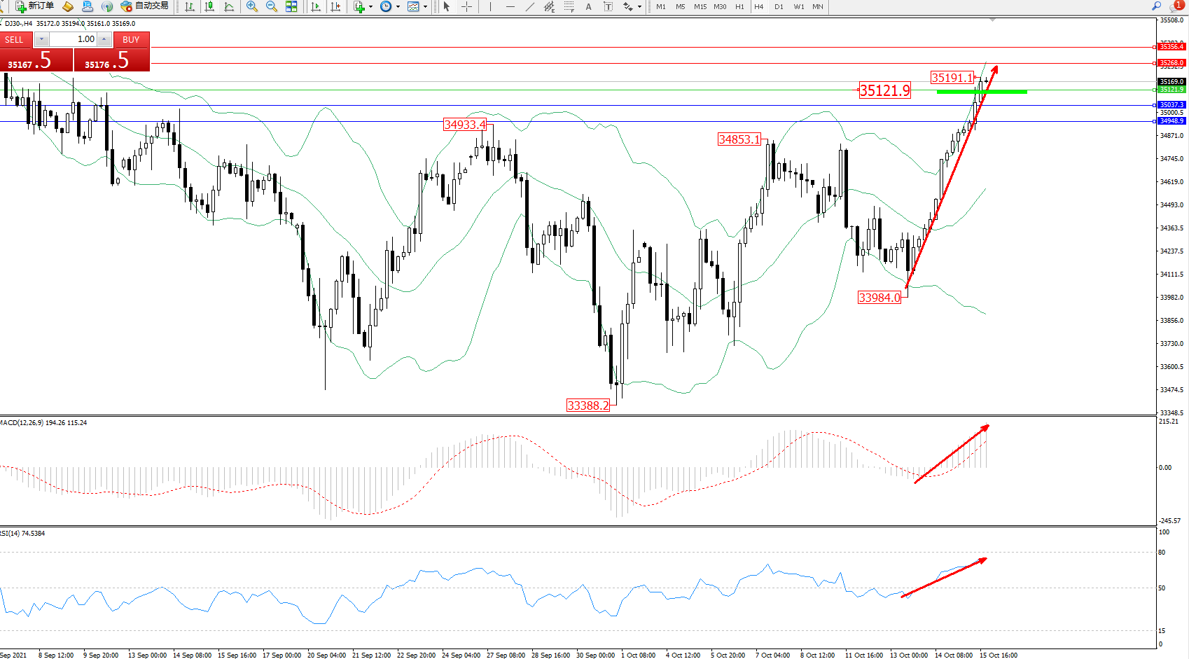 技术点评:多头动力延续布林带指标上轨附近持续震荡上扬,高位抵达35191位置后开始整理,多头动力有继续攀升态势,布林带指标呈张口走势持续中,MACD指标处于多头区域持续震荡上扬,RSI指标处于多头区域维持整理上移,即将处于超买区80均衡线附近节点;