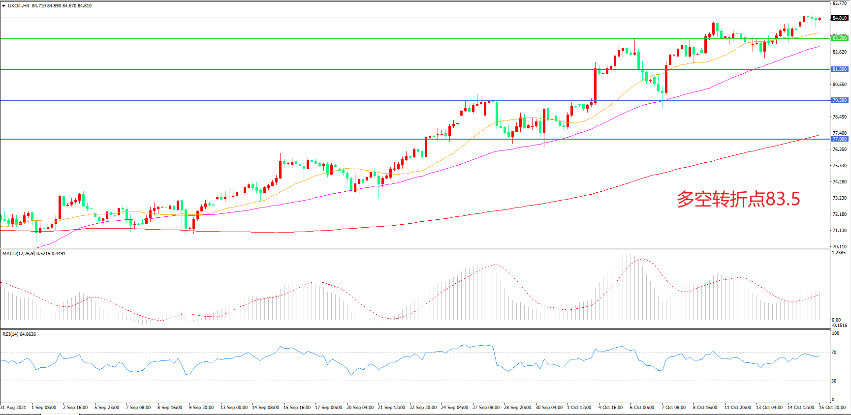 4小时图看,油价整体呈现高位震荡形态,均线系统呈多头排列,MACD红柱缩短,RSI指标走平,日内延续震荡概率较大。