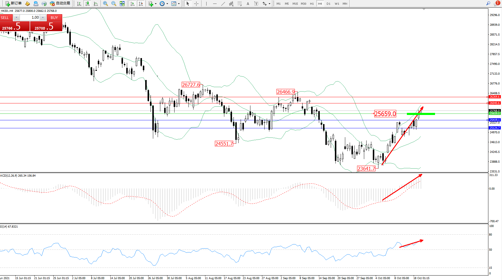 香港恒生指数10月19日(周二)收盘上涨377.46点,涨幅1.49%,报25787.21点;港股三大指数高开高走,尾盘涨幅进一步扩大。恒生科技指数涨3.07%报6518点。科技股再度暴动,引领市场情绪好转,快手大涨近10%,小米涨超5%,阿里巴巴、美团、腾讯皆上扬;大金融股(银行、保险、券商)亦全线走高助力大市上涨,风电股持续强势领涨,苹果概念股、家电股、半导体股多数上扬;中国拟将每年8月8日确立为国家体育节,体育用品股午后涨幅明显扩大,特步大涨近8%。