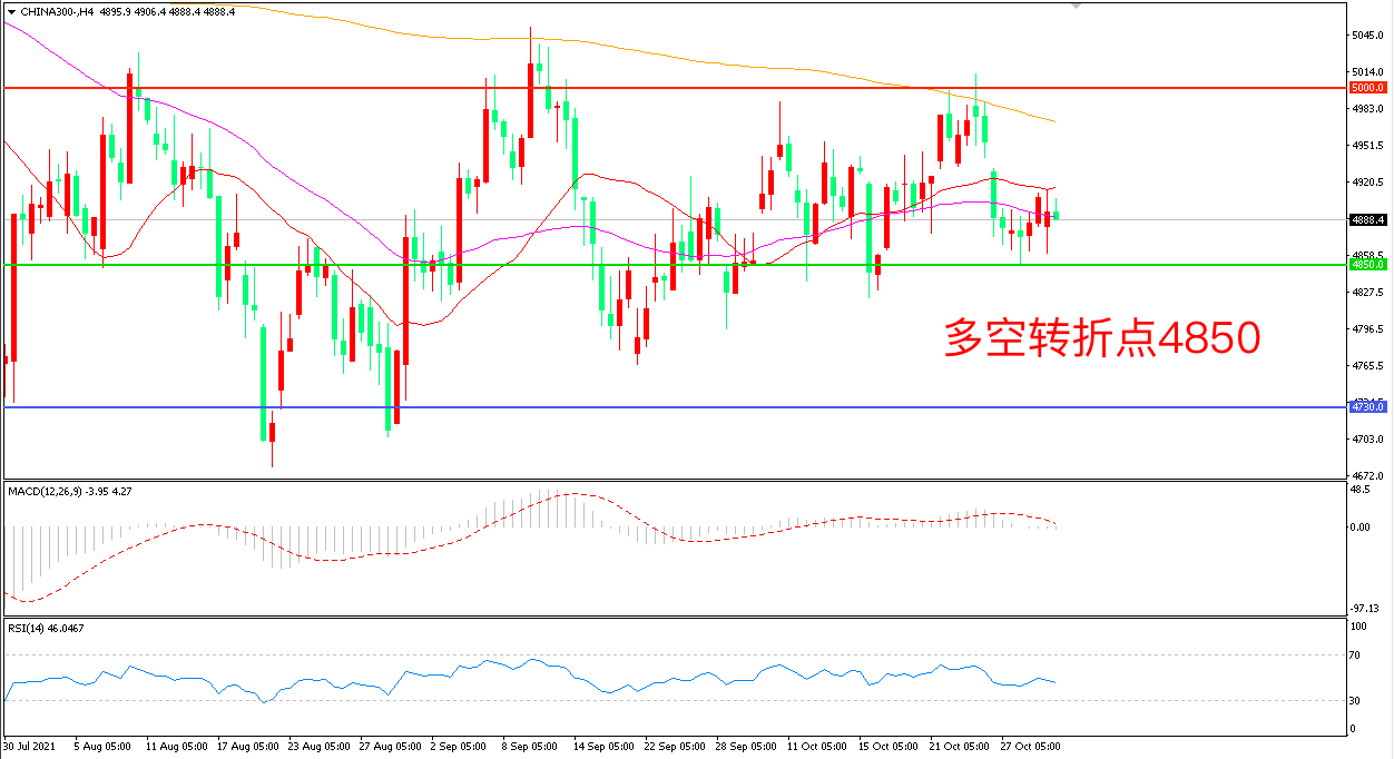 4小时图看,沪深300延续区间震荡形态 ,4850成为下方支撑,200周期均线成为上方阻力,MACD红柱减少,RSI指标走平,日内延续震荡概率较大。