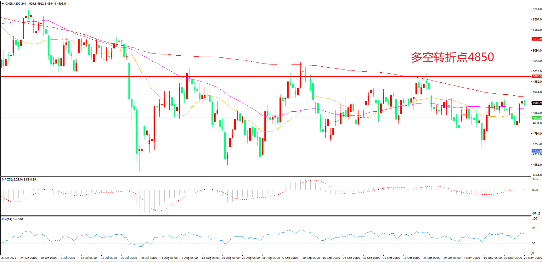 4小时图看,沪深300震荡上行,短期走势有所回暖,200周期均线阻力在即,4850成为下方支撑,MACD红柱缩短,RSI指标走平,日内震荡向上概率较大。
