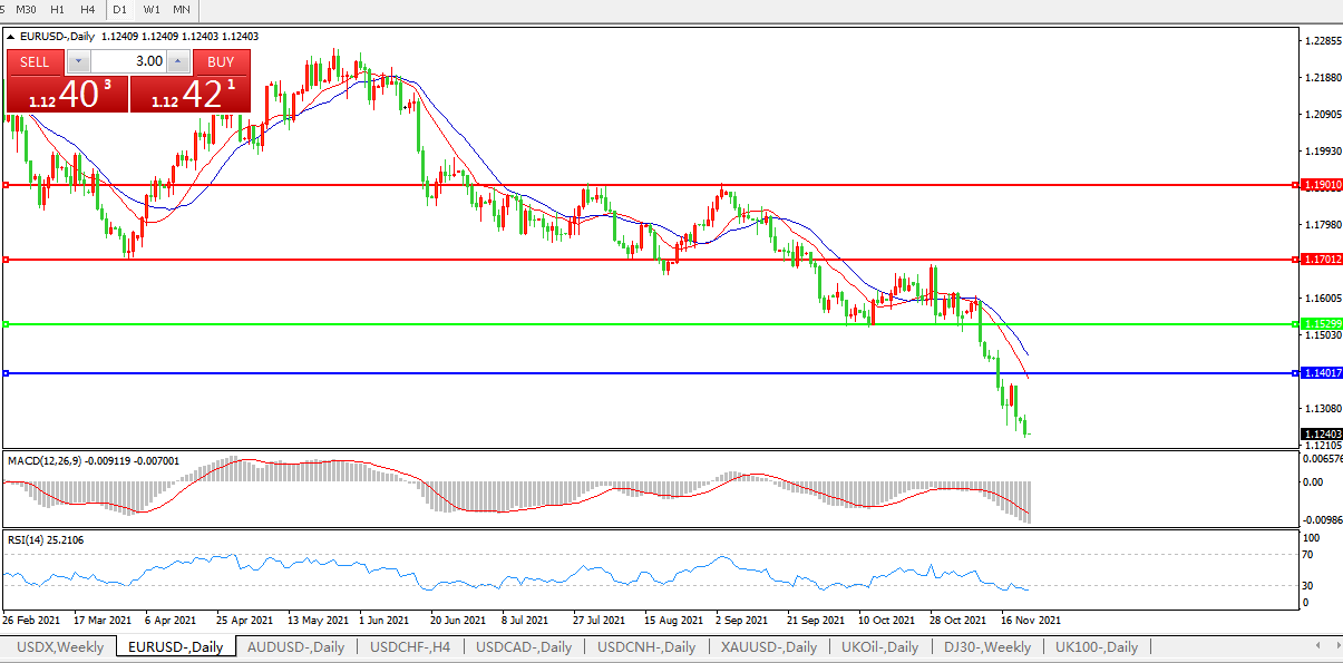 技术面简析:日图均线呈空头排列,汇价继续大跌,MACD运行于0轴下且量能放量,RSI持续弱势,预计短期汇价大概率将进一步下行。