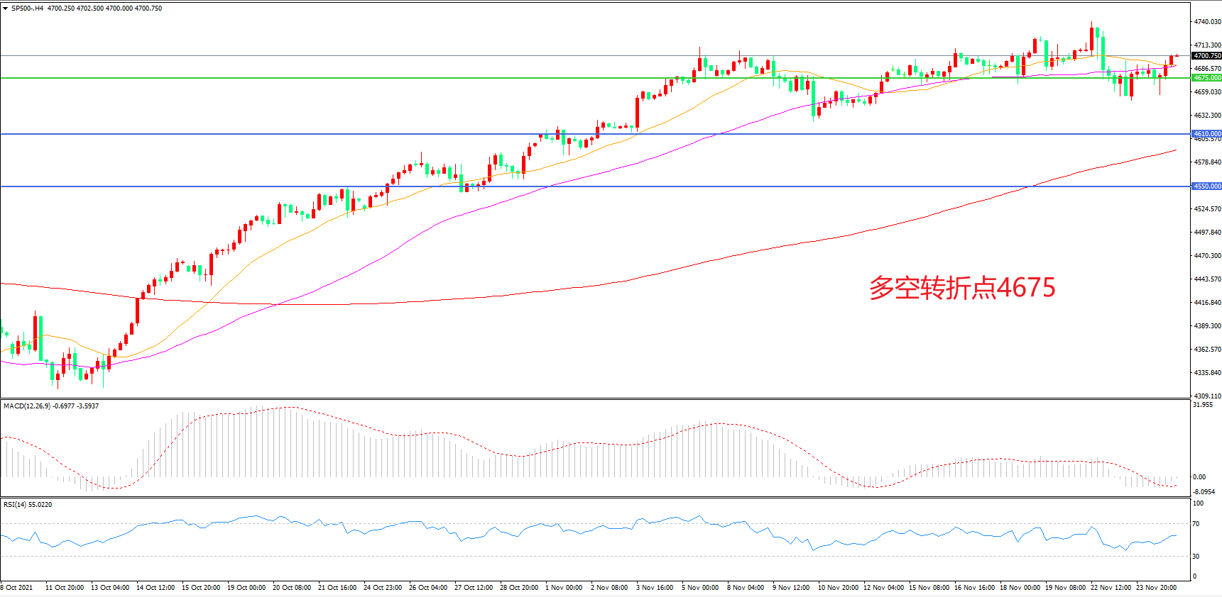 4小时图看,标普500以4675为依托小幅反弹,短期走势回暖,均线系统形成下方支撑,MACD绿柱缩短,RSI指标走平,日内震荡上行概率较大。