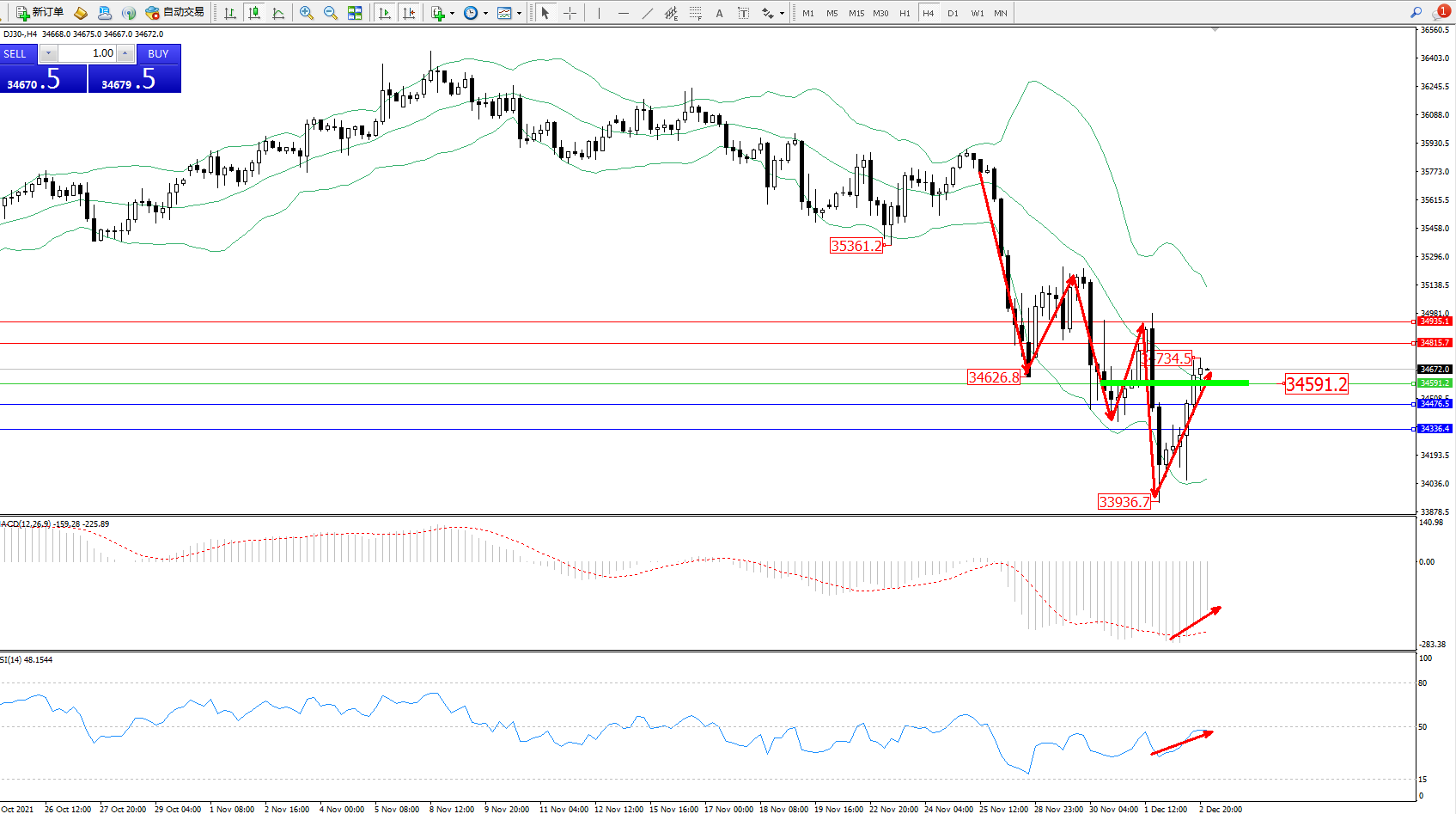 技术点评:长时间维持在布林带指标通道内中下轨区间呈阶梯式震荡向下移动,低位抵达33936位置得到支撑反转上移,缓慢突破布林带指标中轨附近节点后有继续拉升迹象,布林带指标呈收口走势中,低位多头动力有继续向上拉升迹象,MACD指标处于空头区域维持整理缓慢上移,RSI指标处于空头区域持续震荡上移至50均衡线附近徘徊;