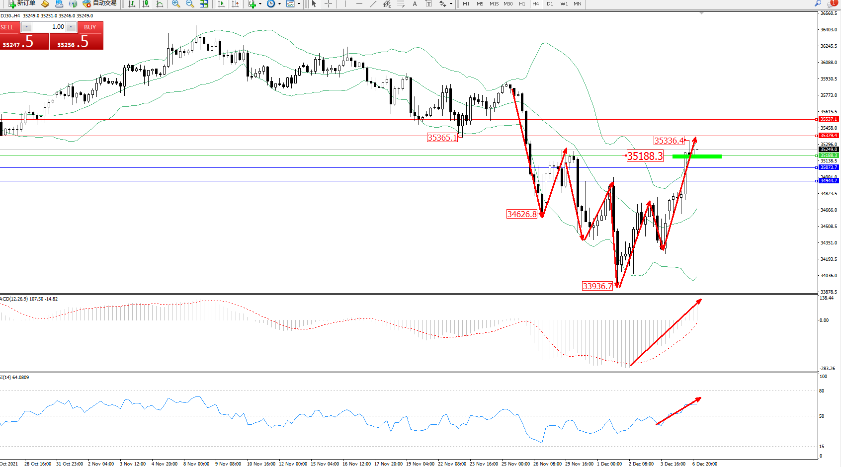 技术点评:空头动力延续布林带指标通道中下轨区间呈阶梯式持续震荡下行,低位抵达33936位置后开始再度呈阶梯式震荡向上拉升中,高位触及35336位置节点后短暂震荡,多头动力有继续攀升态势,布林带指标呈张口走势持续中,MACD指标处于空头区域低位震荡上扬至0轴线上方持续拉升中,RSI指标处于50均衡线上方持续震荡上扬后开始徘徊;