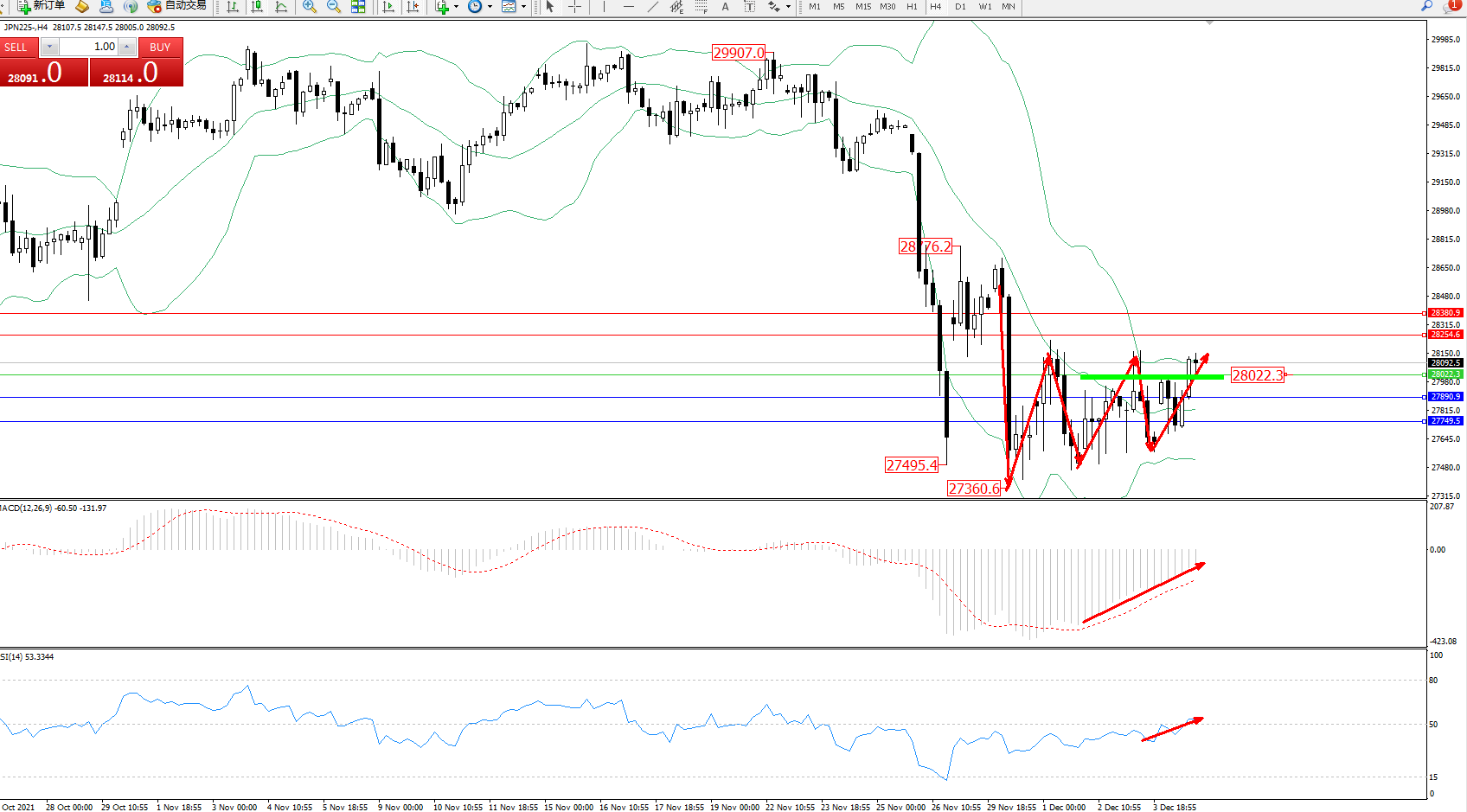 技术点评:空头动力延续布林带指标通道中下轨区间持续震荡下行,低位抵达27360位置节点后开始断震荡回升,短期维持宽幅整理平移,多头动力开始有伺机入场态势,触及布林带指标上轨附近节点后多头动力开始持续向上移动,布林带指标呈收口走势平移中,MACD指标处于空头区域低位震荡缓慢上移,RSI指标处于空头区域维持整理上移至50均衡线上側弱势徘徊中;