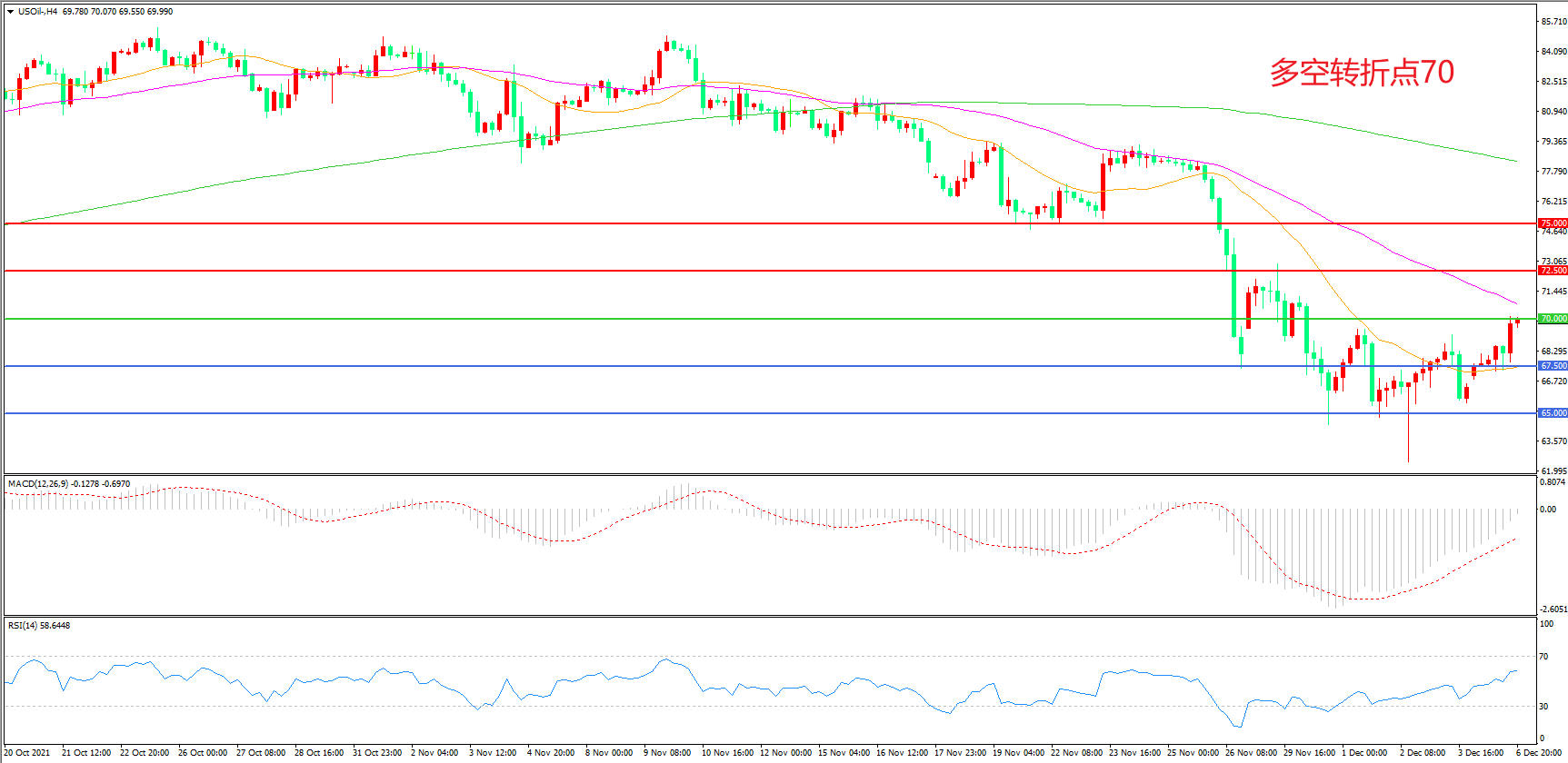 周一(12月6日),美国资深传染病专家福奇称奥密克戎危险性可能低于德尔塔,风险资产全线回暖,美国WTI原油再度反弹,收报69.90美元/桶。近期在OPEC会议落地以及疫情的强力干扰之下,投机资金大量离场,油价快速下行之后,压力已经得到释放,短期内不排除会有一个小幅反弹。